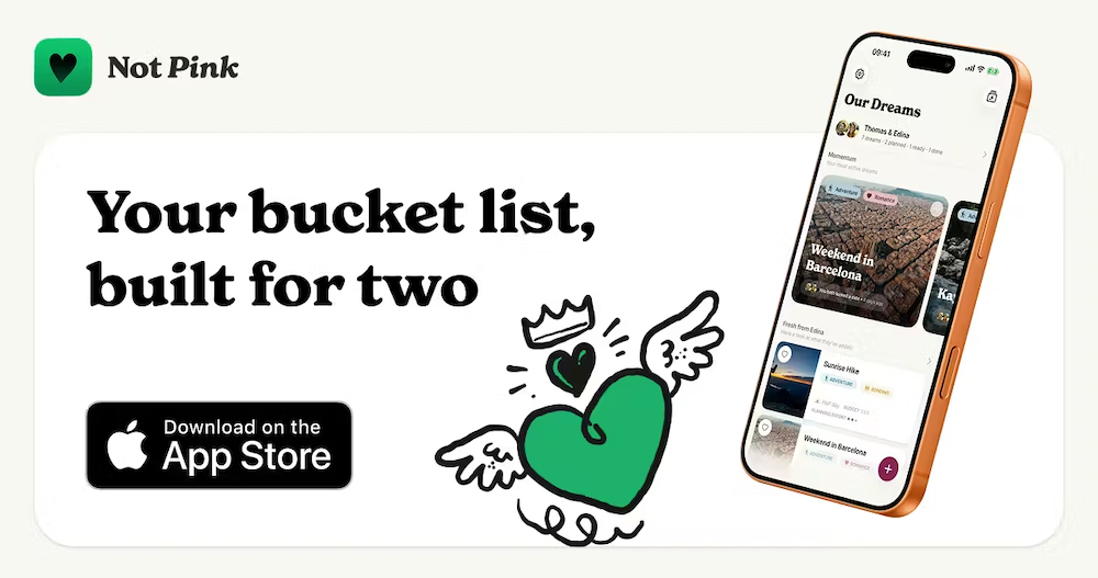 Existing bucket list apps in the category use flat checklists, while most relationship apps focus on long-distance use cases or early-stage couples. Not Pink targets couples aged 28 and older in the United States and the German-speaking region, with broader availability in nine languages.
