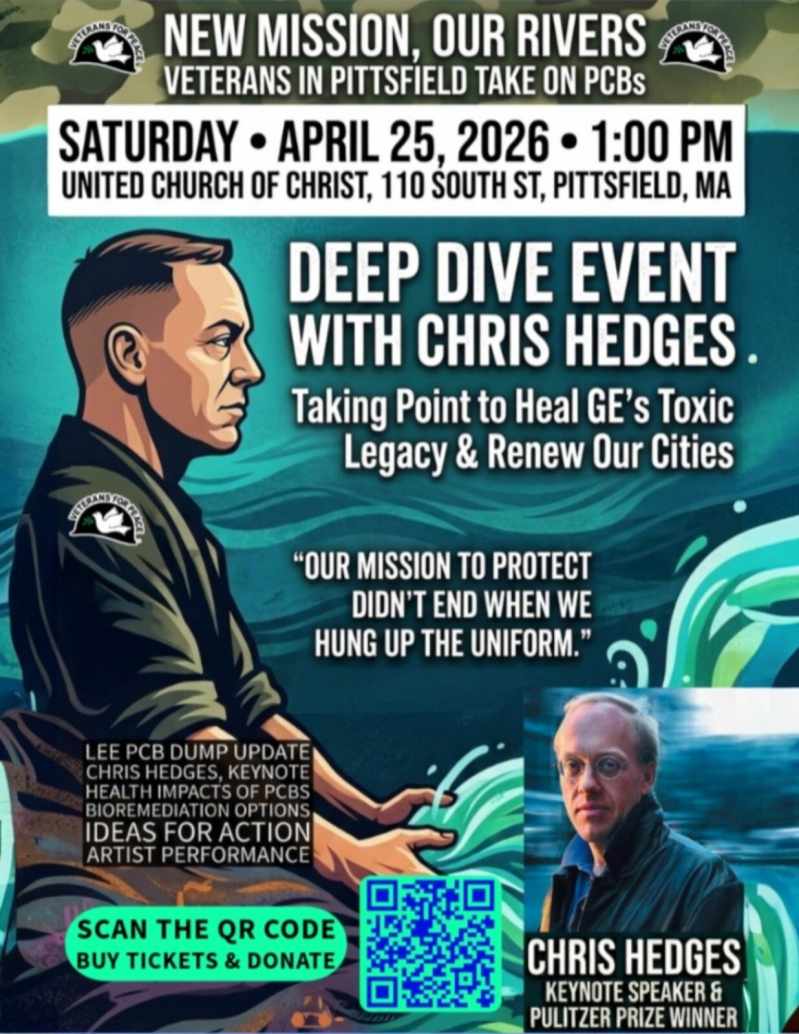 WHY: Despite decades of litigation, the legacy of Polychlorinated Biphenyls (PCBs) remains a critical threat to public health and local waterways. Veterans For Peace, framing environmental protection as a matter of national security and moral obligation, will join Hedges to highlight the intersection of corporate power, military-industrial interests, and ecological destruction.